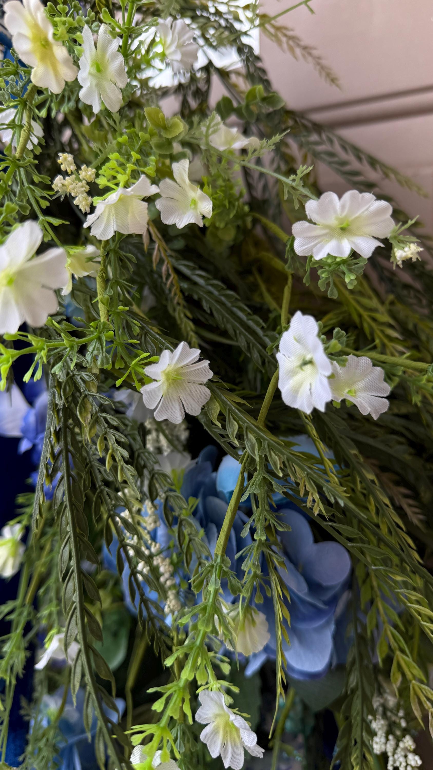 Welcome the beauty of spring with this elegant blue floral wreath, adorned with lush hydrangeas, delicate greenery, and standout chinoiserie ribbon. The classic blue and white pattern of the ribbon adds timeless sophistication, making this wreath a true statement piece for your front door or entryway.