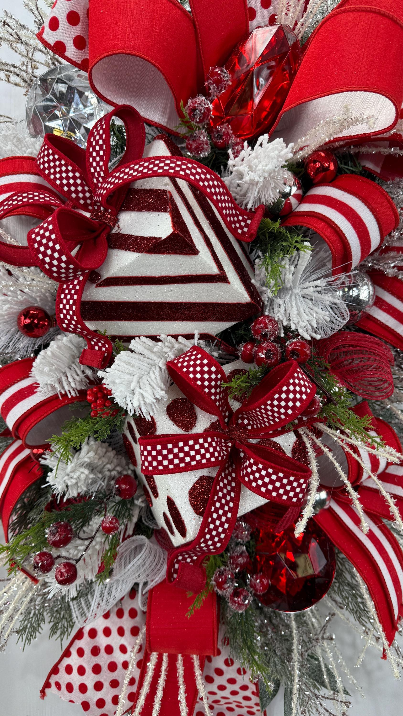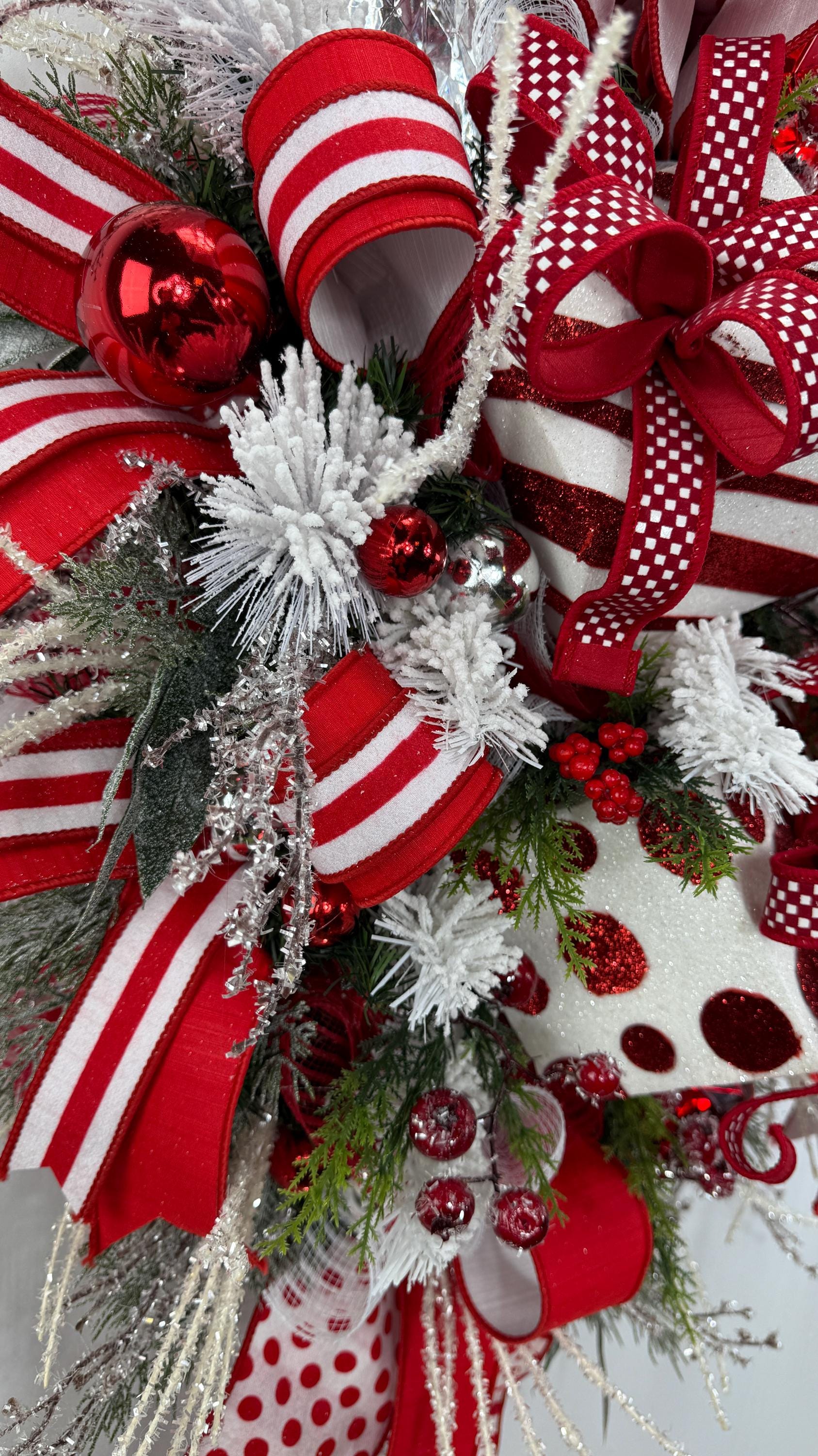 Red and White Christmas Wreath with Polka Dots, Gift Boxes, and Luxe Ribbon, Over the top Christmas Wreath, Winter Wreath, Jewel Wreath
