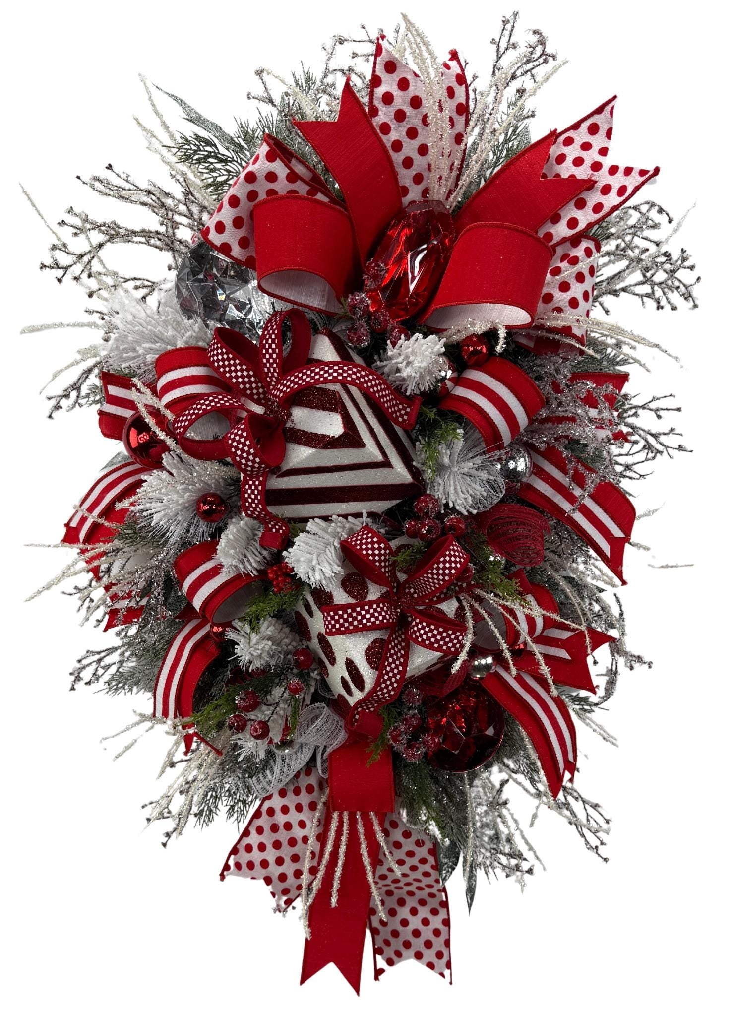 Elevate your holiday decor with this luxurious Red and White Christmas Swag! Perfect for making a bold and festive statement, this handcrafted swag features a mix of polka dot and striped ribbons, shimmering frosted greenery, glittery ornaments, and elegant gift box decorations. Topped with premium, high-quality luxe ribbons, this swag is ideal for front doors, mantels, or entryways, adding sophistication and holiday cheer to any space. Materials: High-quality artificial frosted greenery Premium polka dot and striped luxe ribbons Glittery ornaments in festive red and white Miniature decorative gift boxes for an extra festive touch Durable swag base for stability Size: Approximately 41 inches in height and 25 inches in width Key Features: Luxurious holiday design with premium ribbons in polka dot and striped patterns Features beautifully hand detailed decorative gift boxes to enhance holiday charm Suitable for indoor and covered outdoor use Special care: Keep out of direct sunlight and heavy rain for longevity Packaging: Carefully packaged to ensure it arrives in perfect condition Ready to hang upon arrival with a secure hook included This vibrant swag makes the perfect addition to your holiday decor, or a thoughtful gift for someone who loves elegant and festive decorations. Add a touch of sophistication and joy to your Christmas celebrations by ordering yours today!